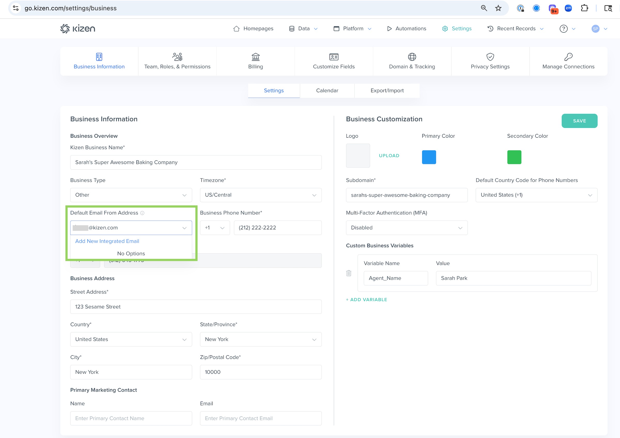 Note: Federal law requires a valid physical postal address to be included on all commercial emails. Emails sent from Kizen will automatically include the Business Address listed in your settings, as well as the option to opt out of future marketing emails, at the bottom of your emails. Learn more about CAN-SPAM Act requirements here.How to Set Up Additional Integrated Inbox Emails
