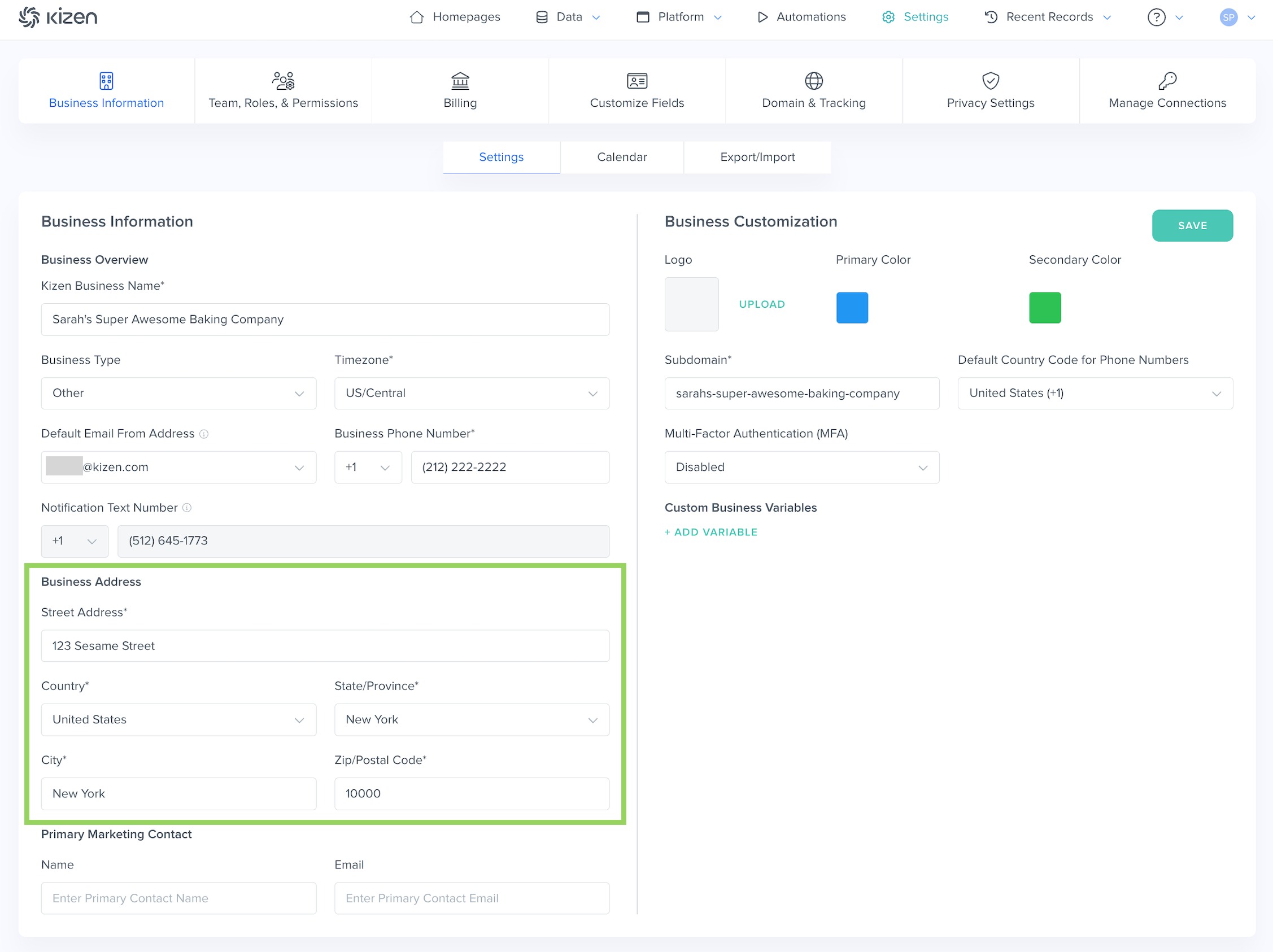 - Make sure to fill out the "Business Address" section and click on the teal "Save" button on the right side. You will not be able to send out emails successfully without a business address.